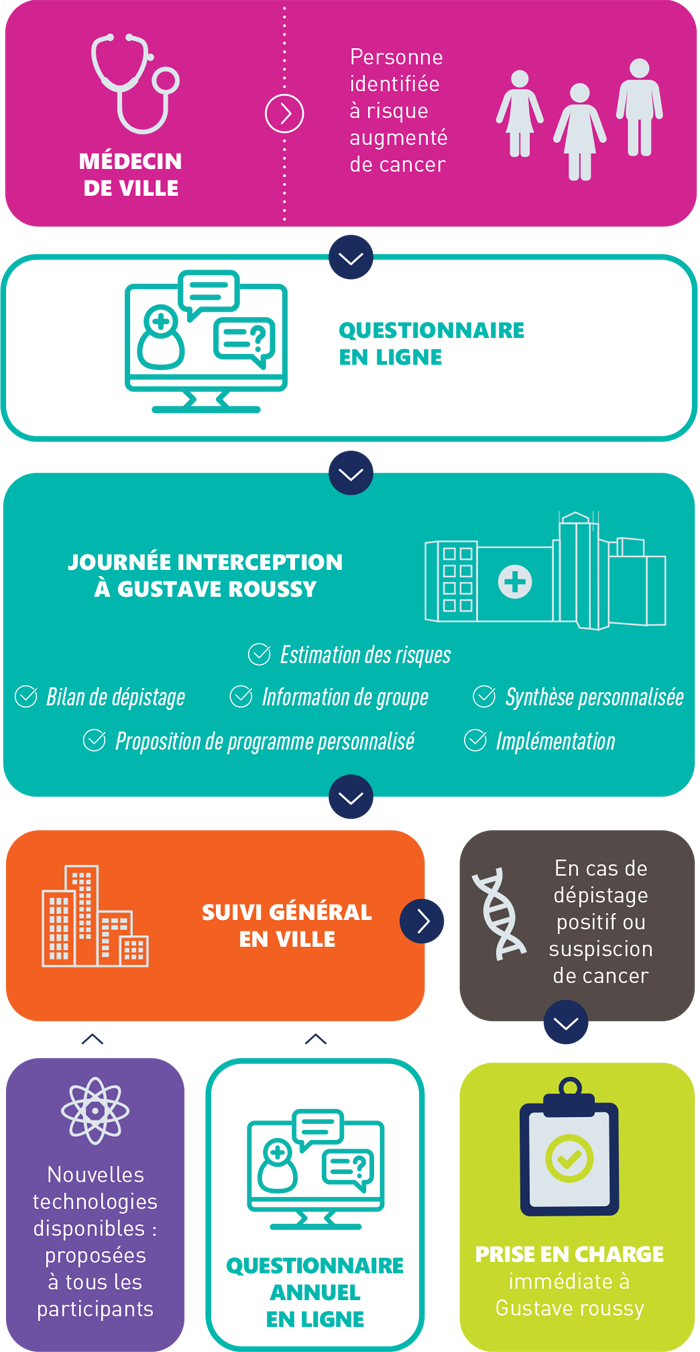 Le programme Interception de Gustave Roussy a pour objectif d’identifier au plus tôt les personnes à risque augmenté de cancer afin de leur proposer une prévention personnalisée et de mieux les prendre en charge, dans le cadre d’une collaboration ville-hôpital. Il vise également à développer pour les années qui viennent de nouveaux modes de dépistage et prévention du cancer adaptés pour ces personnes.